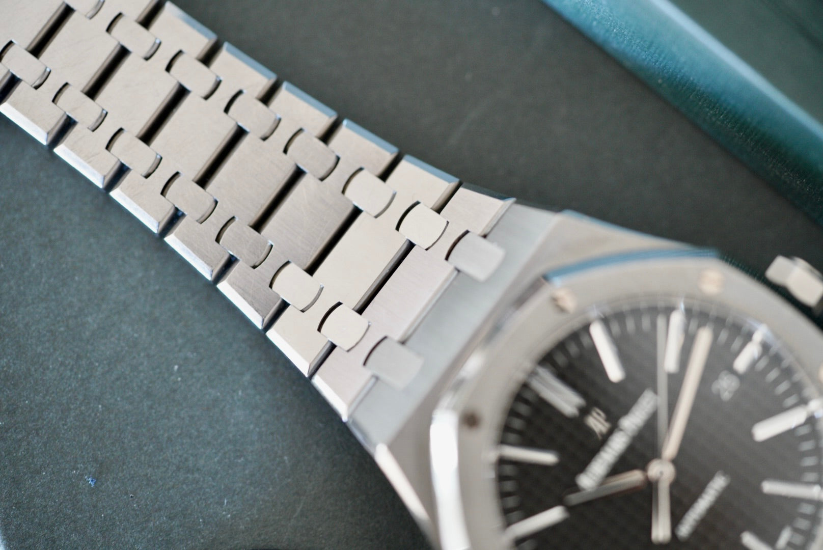- Crisp black tapisserie dial with no flaws