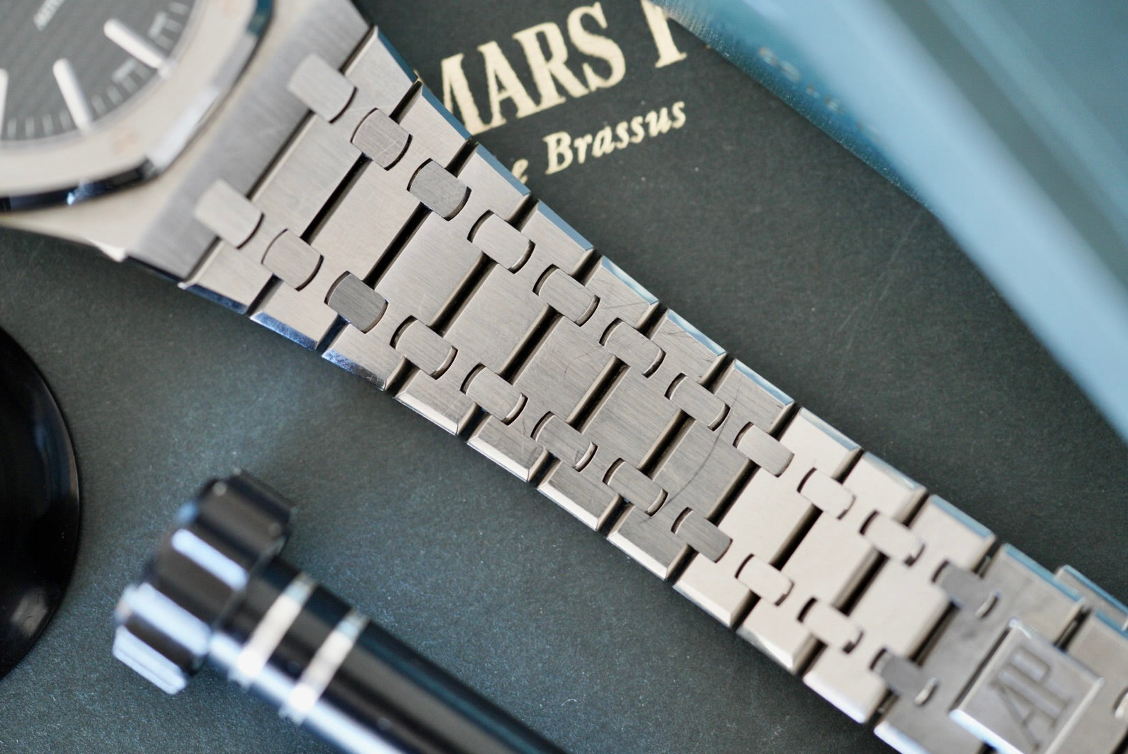 Comes as a complete set: Watch, inner and outer box, papers, booklets, and the full 23 link bracelet.