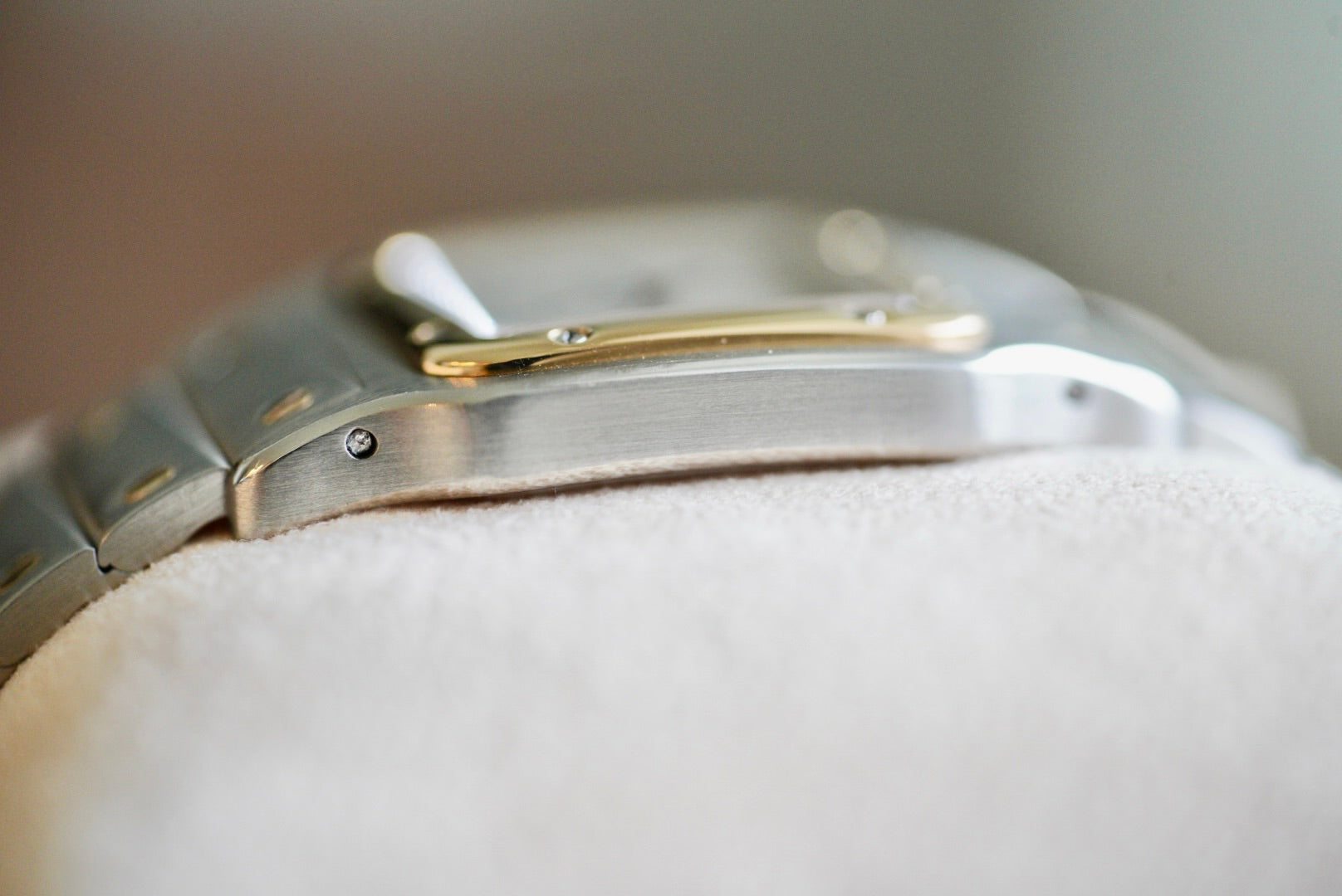 - Stainless steel Santos Galbée case in very good overall condition with light, honest wear