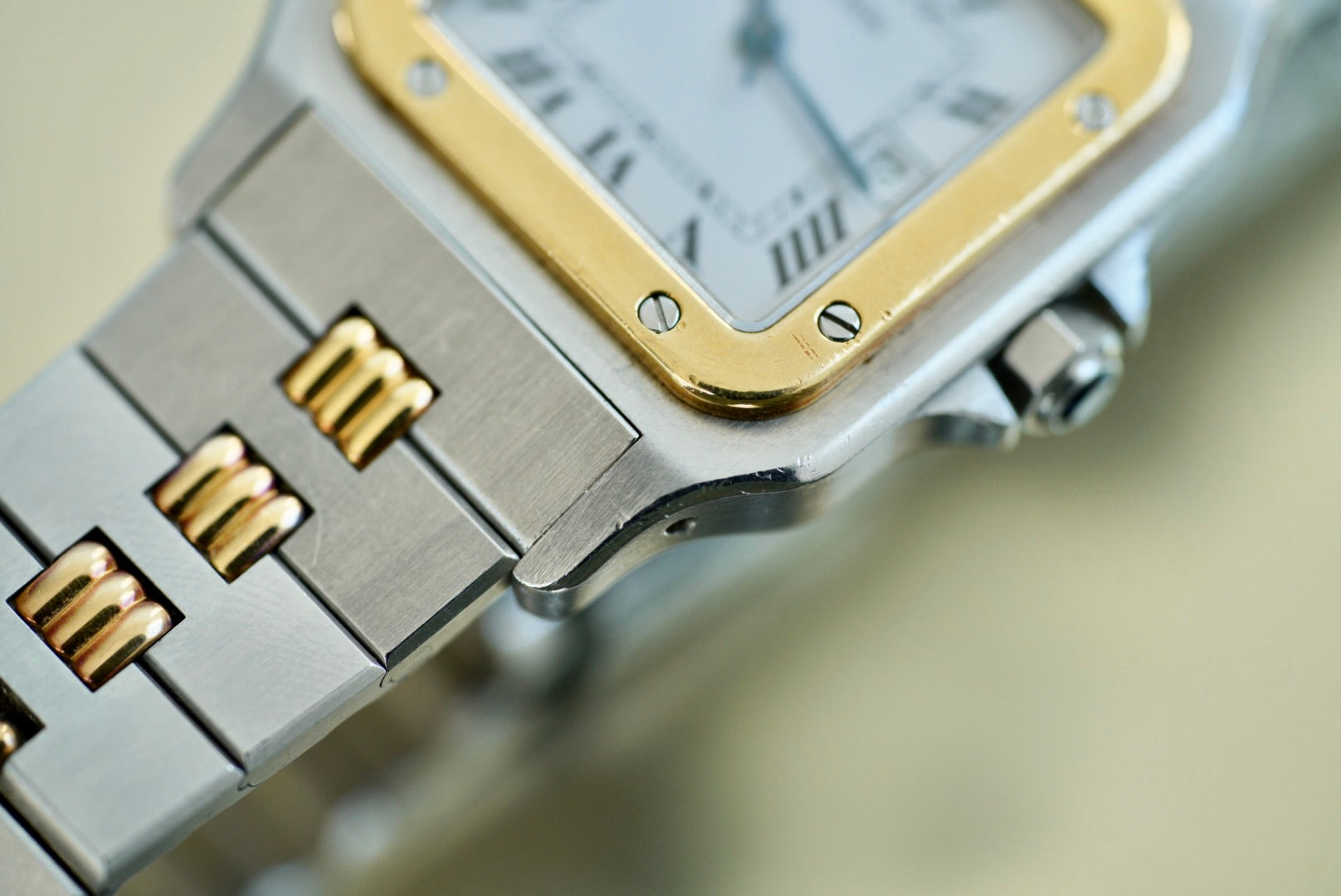 - Classic square Carrée case with clean edges and strong presence on the wrist